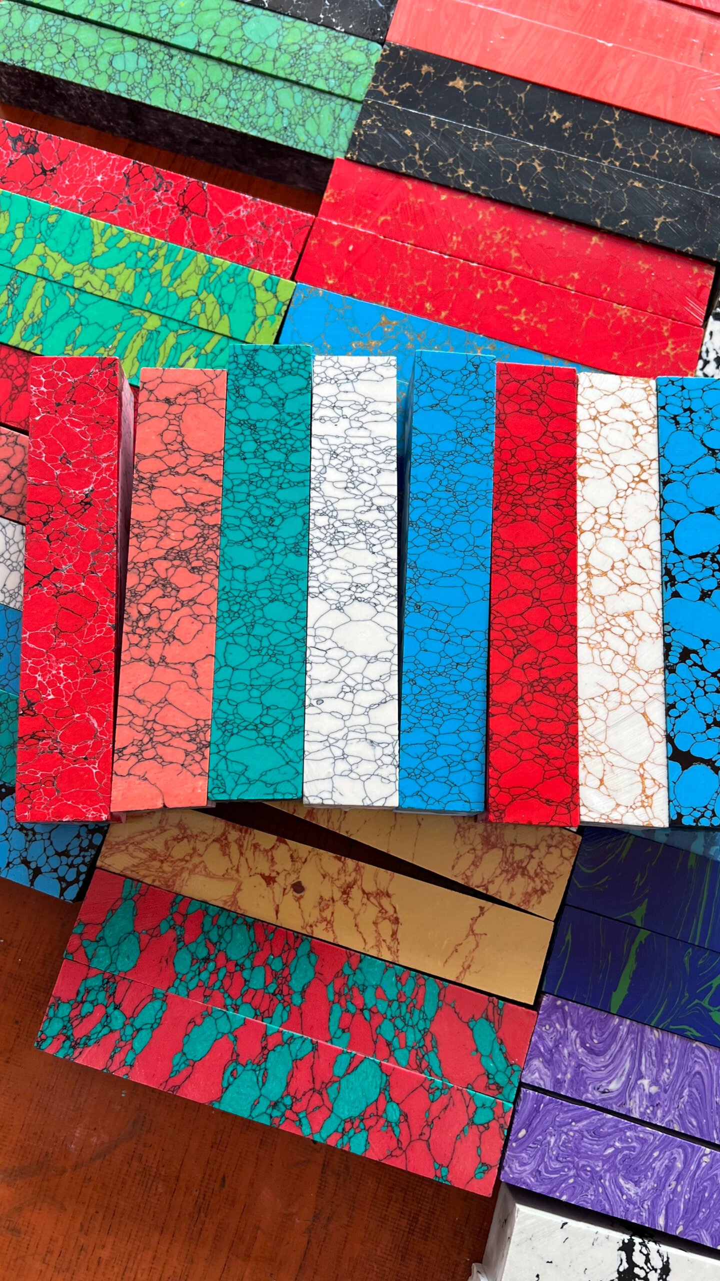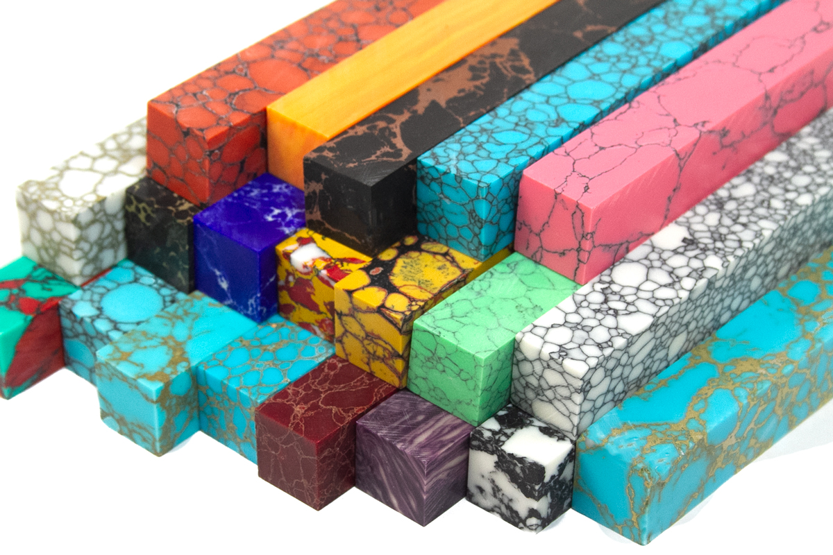 Our catalog features synthetic versions of iconic natural stones such as Onyx, Red Coral, Malachite, Turquoise, Lapis Lazuli, Opal, and Jasper, engineered to provide consistent density, stable color, and high durability without the structural limitations of raw natural stone. These materials are trusted by knife makers, jewelry designers, interior decorators, furniture brands, and OEM producers who require reliable, repeatable results.